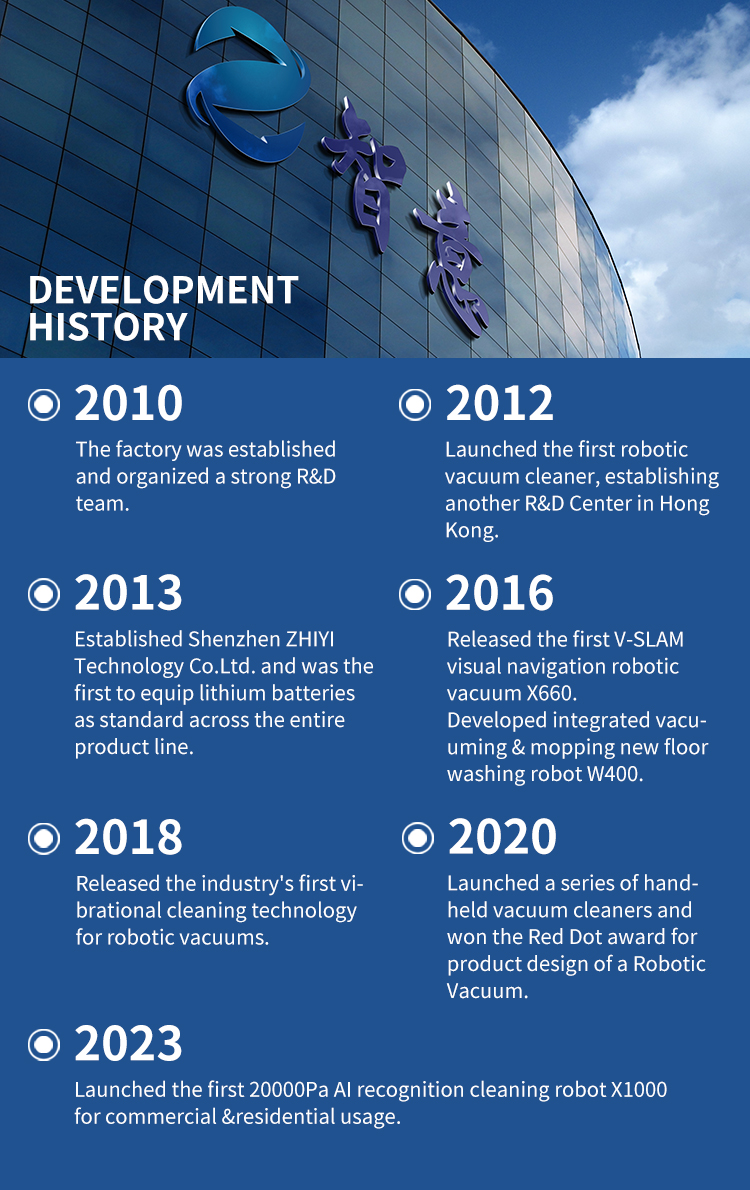 ZHIYI Group was established in 2010. It is a dual high-technology enterprise that integrates research & development, production, and sales. It is a professional manufacturer specializing in intelligent products such as robotic vacuum cleaners, commercial cleaning robots, floor washing robots, handheld vacuums, etc. Its sales network covers over 35 countries, the products sell well all over the world.